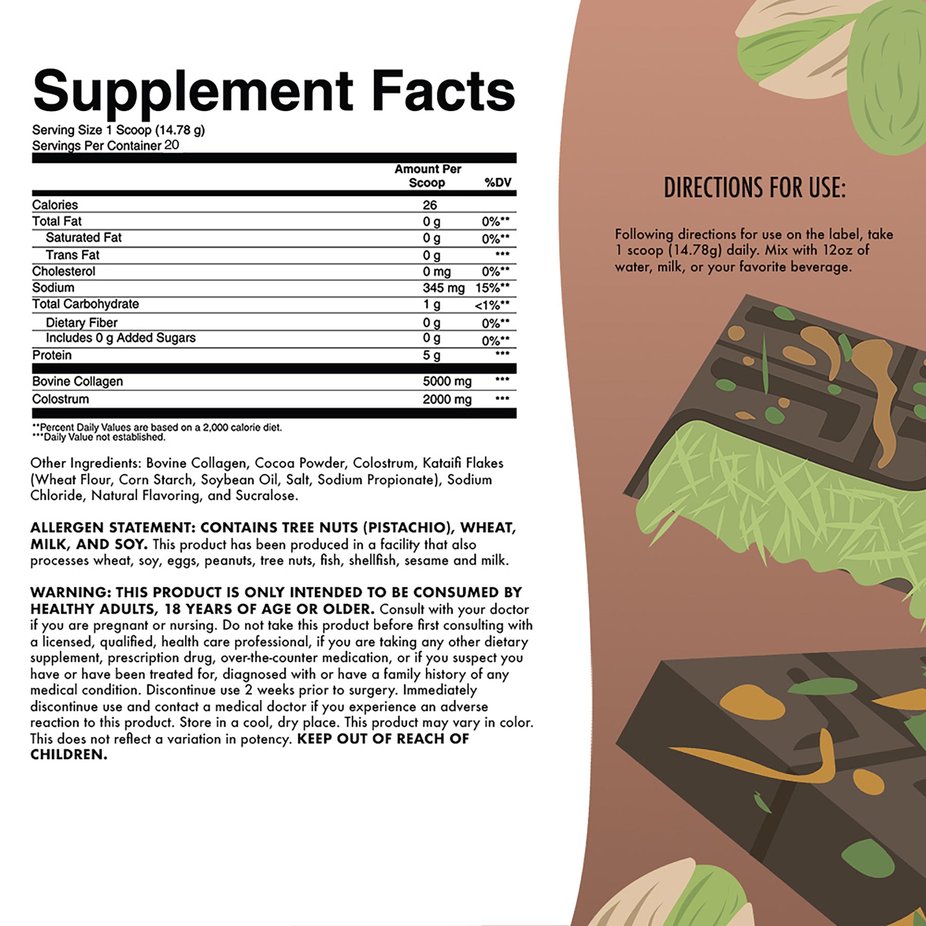 Other Ingredients: Bovine Collagen, Cocoa Powder, Colostrum, Kataifi Flakes (Wheat Flour, Corn Starch, Soybean Oil, Salt, Sodium Propionate), Sodium Chloride, Citric Acid, and Sucralose.