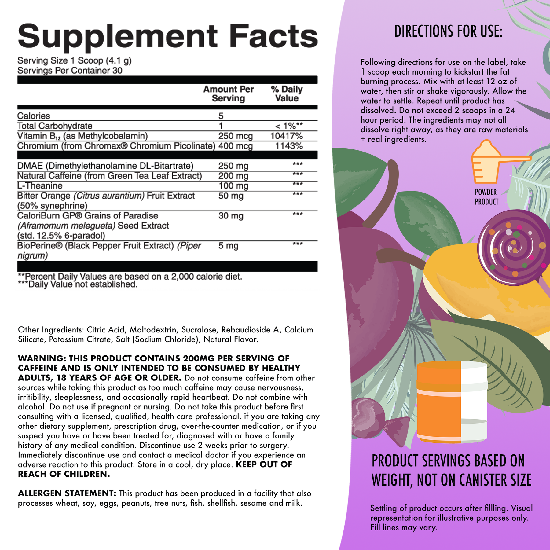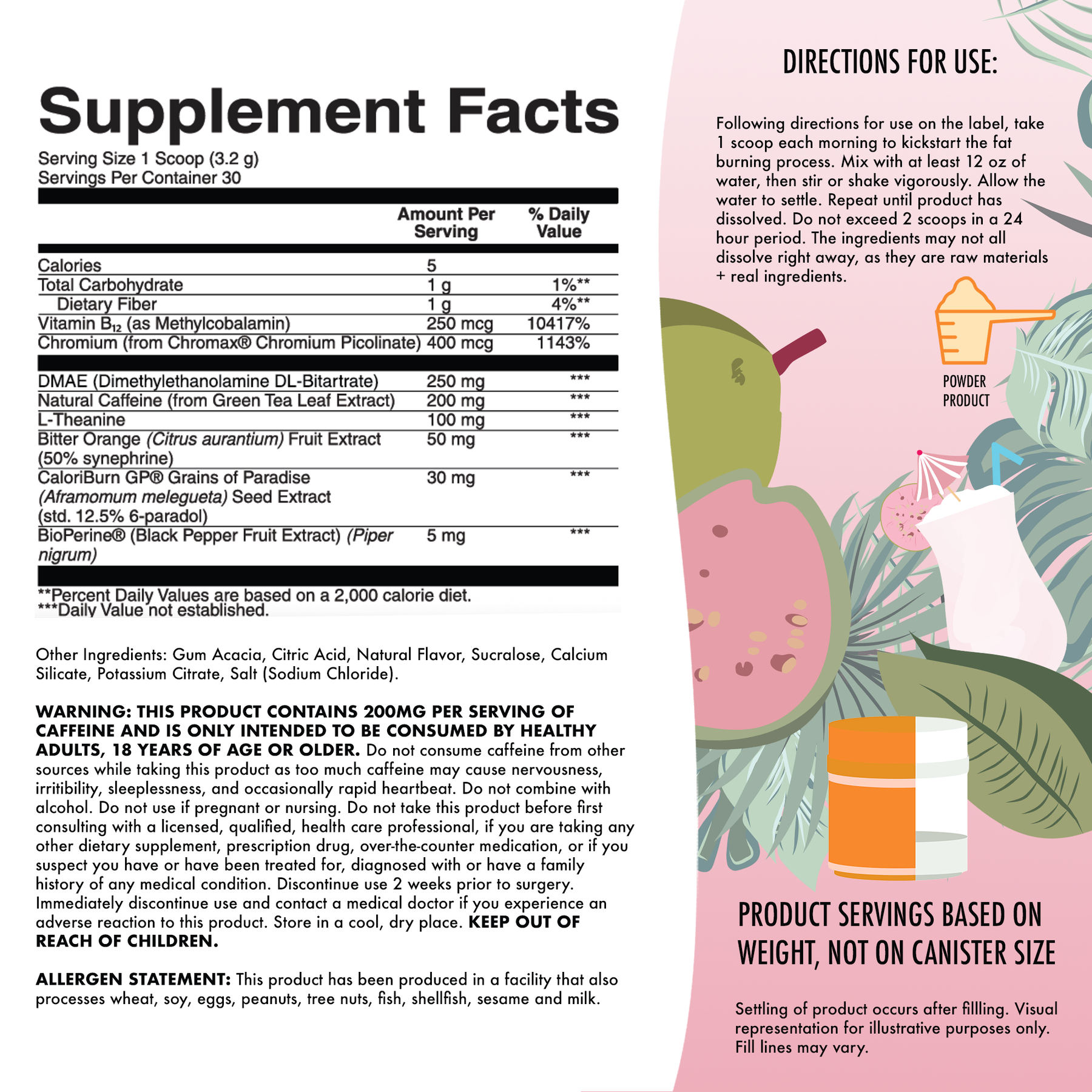 WARNING: THIS PRODUCT CONTAINS 200MG PER SERVING OF CAFFEINE AND IS ONLY INTENDED TO BE CONSUMED BY HEALTHY ADULTS, 18 YEARS OF AGE OR OLDER. Do not consume caffeine from other sources while taking this product as too much caffeine may cause nervousness, irritibility, sleeplessness, and occasionally rapid heartbeat. Do not combine with alcohol. Do not use if pregnant or nursing. Do not take this product before first consulting with a licensed, qualified, health care professional, if you are taking any other dietary supplement, prescription drug, over-the-counter medication, or if you suspect you have or have been treated for, diagnosed with or have a family history of any medical condition. Discontinue use 2 weeks prior to surgery. Immediately discontinue use and contact a medical doctor if you experience an adverse reaction to this product. Store in a cool, dry place. KEEP OUT OF REACH OF CHILDREN. This product may vary in color. This does not reflect a variation in potency. This product is sold by weight, not volume. Some settling of powder may occur during shipping and handling, which may affect density of powder. This product contains the servings indicated when measured exactly by weight.