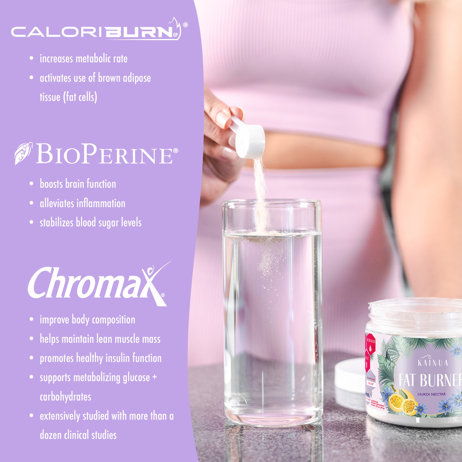 Caloriburn increases metabolic rate (i.e., caloric expenditure) in a small, potent dose. It activates the metabolically active, highly thermogenic Brown Adipose Tissue (BAT). It is a non-stimulatory thermogenic that’s safe to use any time of day, with a long history of use in food supply and a strong safety profile.