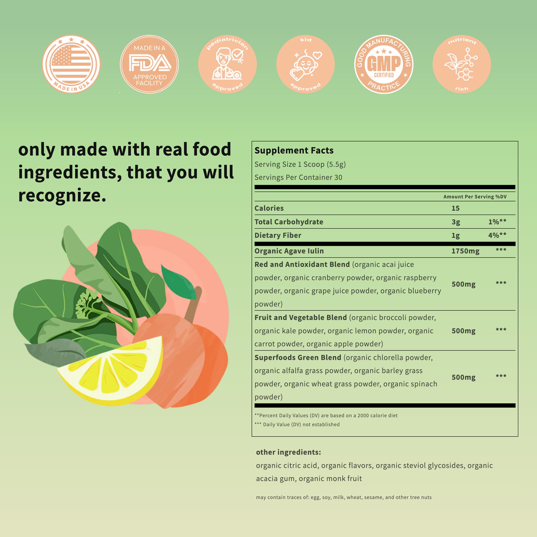 kainuakids greens offers additional dietary fiber in your child's diet, antioxidants to help fight off free radicals, superfoods to help reduce inflammation in the body, energy boost, immune system boost, and organic fruits and vegetables to help fill gaps in your child's diet!